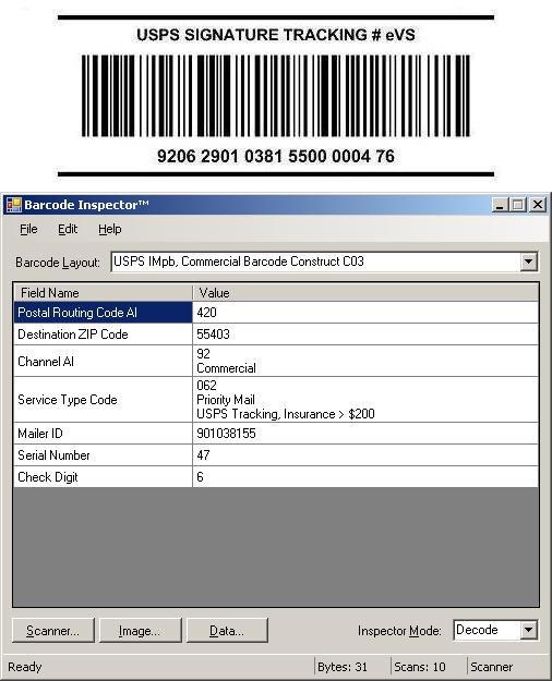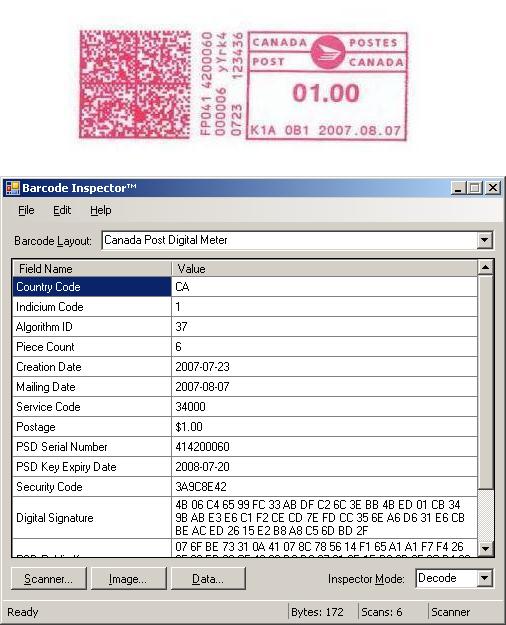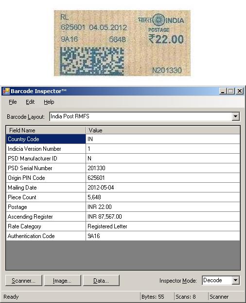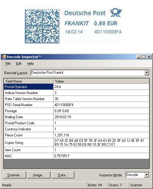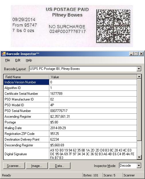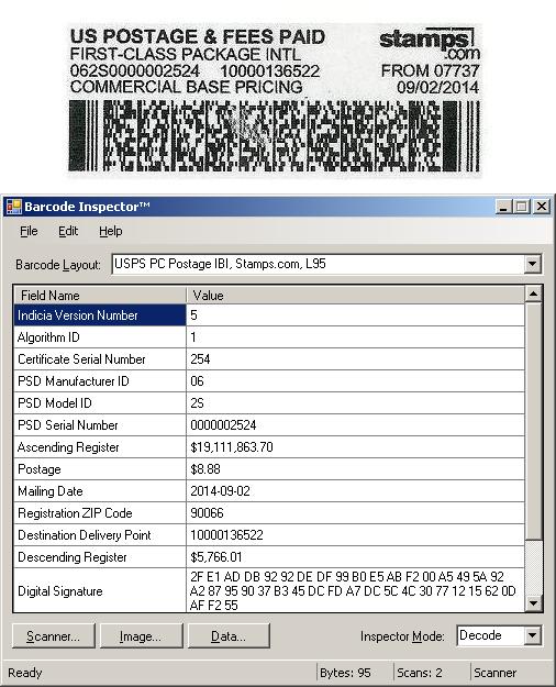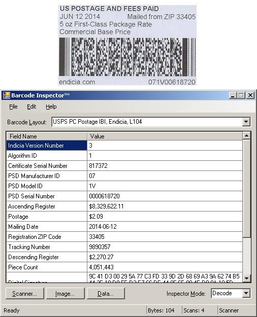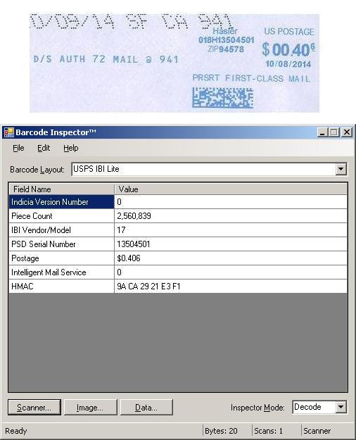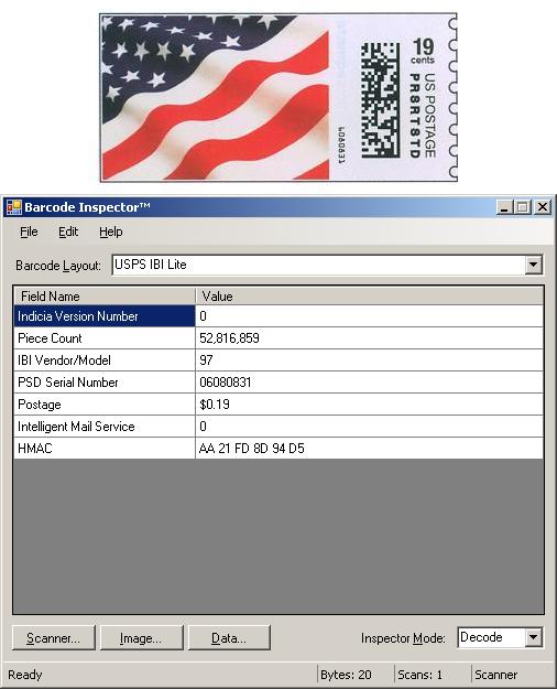 Barcode Inspector allows you to scan, decode, audit, and verify the electronic postage barcode on a shipping label. It recognizes the Information-Based Indicia (IBI) barcodes used by the United States Postal Service and barcode formats of other international postal authorities.